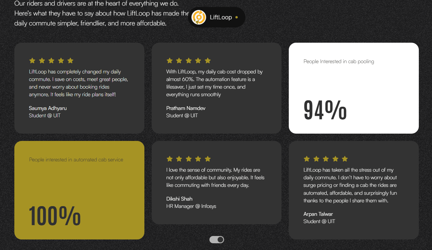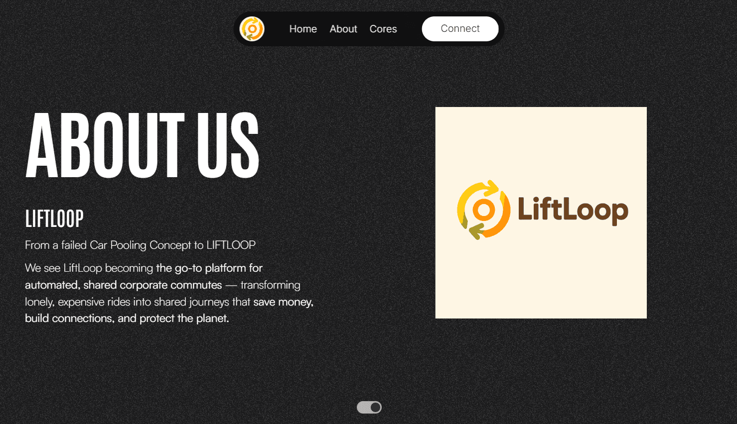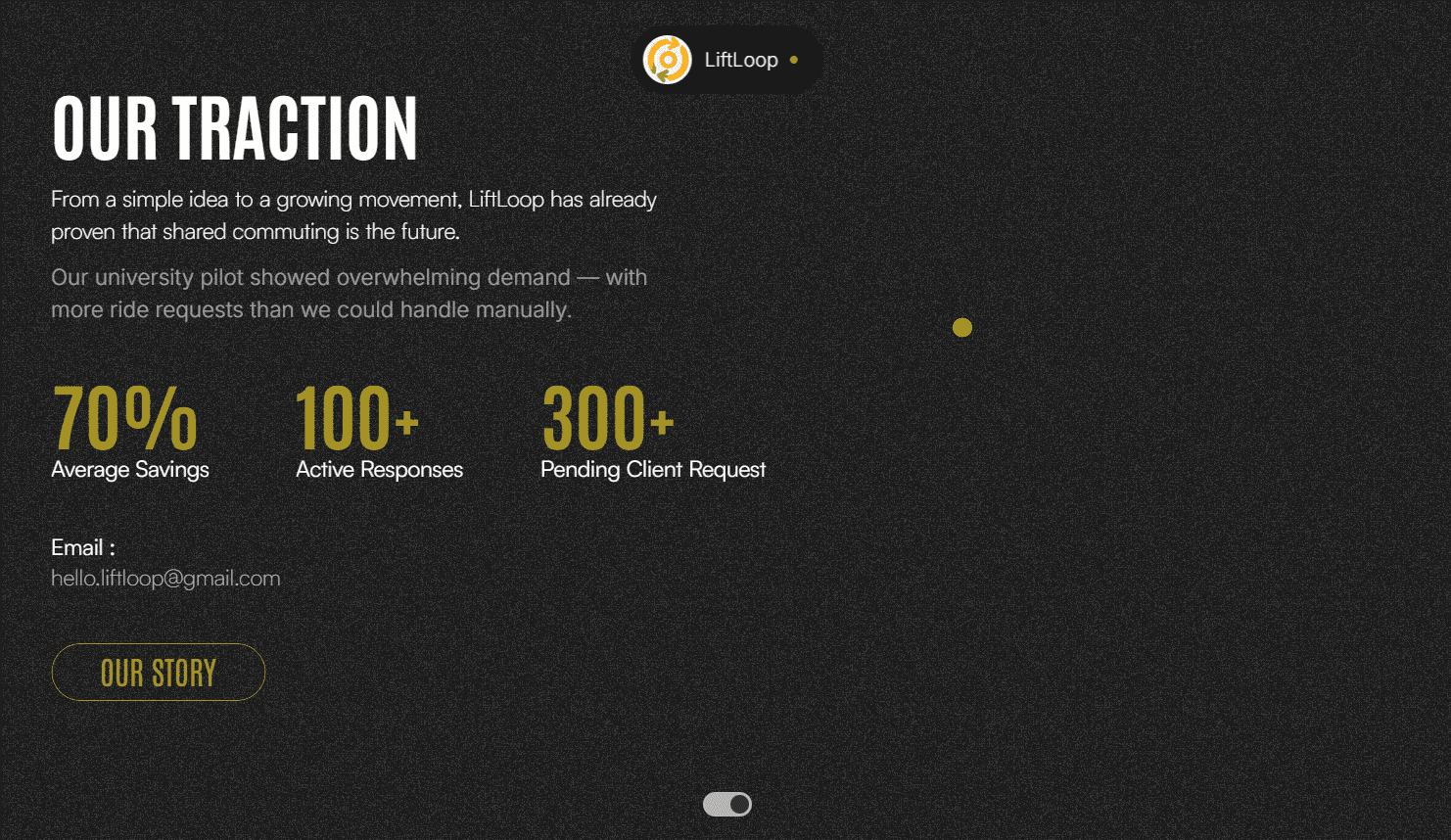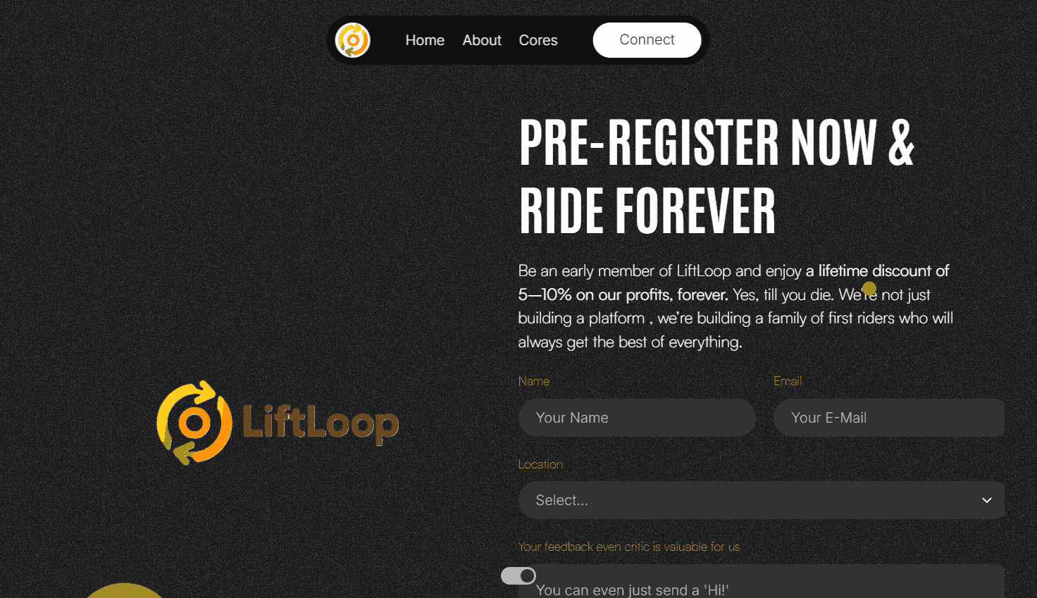 LiftLoop isn’t just about moving from point A to point B ,it’s about creating a loop of trust, savings, and shared journeys. The website reflects this vision by combining a sharp digital identity with user-focused storytelling.