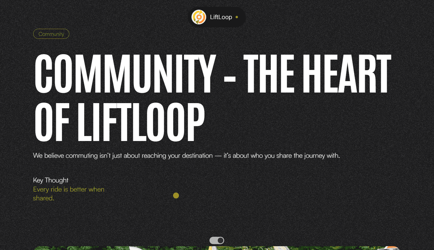 LiftLoop is a next-generation ride-sharing platform designed to make everyday travel smarter, more social, and more sustainable. Built around the idea of community-driven commuting, it connects people heading in the same direction, turning every ride into an opportunity to share, save, and simplify.